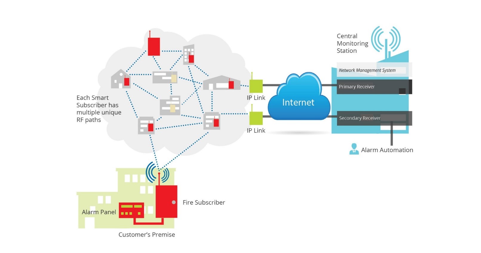 Mesh radio technology is conceptually simple. Signals that need to get from a monitored alarm panel to the Central Monitoring Station may go either directly from the smart subscriber at the alarm panel to the receiver in the Central Monitoring Station or it will ‘hop’ through other subscribers along the way via multiple paths until it gets a confirmed delivery at the Central Station. Protect your most precious assets with leading edge alarm communications.